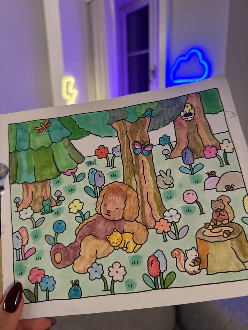 I picked a forest scene: a bear resting, a cat curled under his arm, squirrels eating in a garden, flowers everywhere.