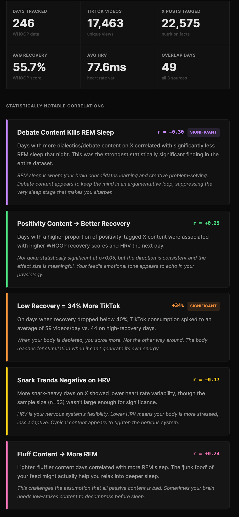 Full dataset: 22,575 X posts tagged; average WHOOP recovery 55.7%, HRV 77.6 ms, sleep efficiency 92.2%. No strong cross-platform correlations due to TikTok gaps, but X “positivity” days boost next-day HRV by ~5 ms (dashboard)